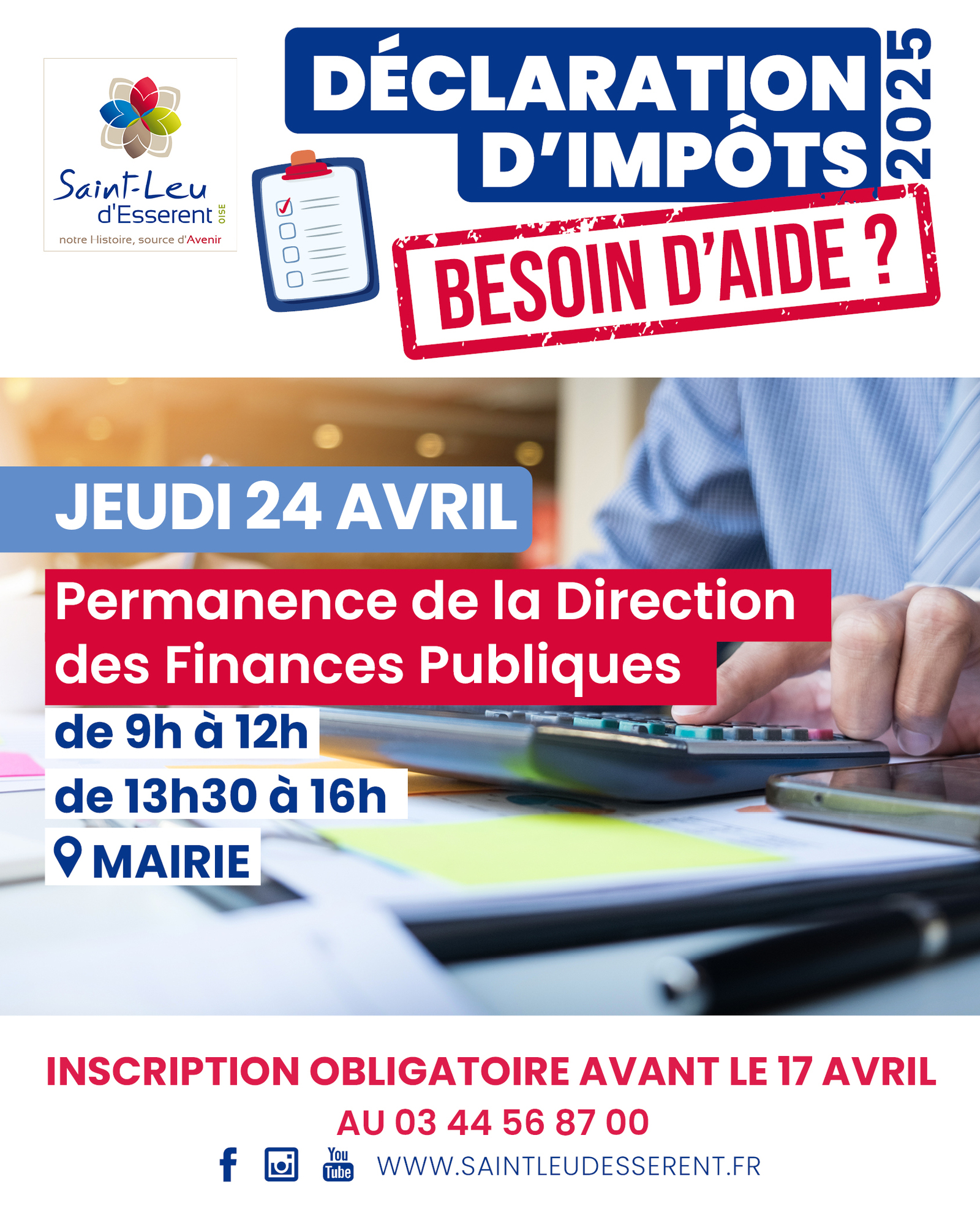 AIDE A LA DÉCLARATION D'IMPÔTS jeudi 24 avril | 9h à 12h et de 13h30 à 16h - Mairie - Cette permanence de la direction des finances publiques vous est proposée afin de vous aider dans votre déclaration d'impôts.