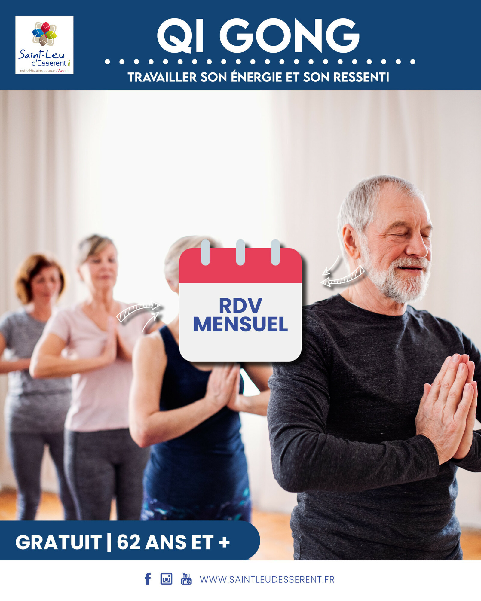 | Qi Gong 16/10 ; 6/11 ; 11/12 ; 15/01 ; 05/02 ; 19/03 ; 02/04 ; 14/05 ; 18/06 ; 02/07 de 17h30 à 18h30 Résidence du Parc Sur inscription, au moins 48h à l'avance - Gratuit (Ouvert à tous les seniors de 62 ans et plus) 03 44 56 60 02 - social@saintleudesserent.fr |